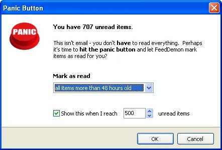 7. Reduce RSS Stress - RSS is not like email - so you don’t have to read everything. If there are too many unread stories in your reader, this new Panic Button will allow you to mark all those items as read which were published say more than 48 hours ago.